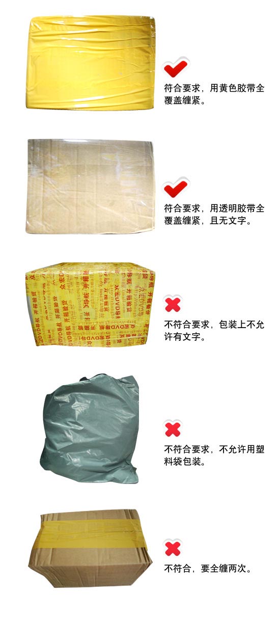2. 包裹最外层包装可以使用透明、黄色或棕色胶带缠绕两遍,胶带上不得有任何标识,且箱子上不能有文字、图片、广告等信息,否则会导致退件。
